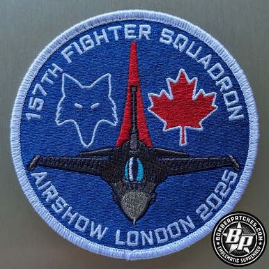 Designed and produced for the 157th FS, South Carolina Air National Guard for their participation in the London England Airshow. 2025 4″ dia, 100% embroidered, merrowed border, hook back.