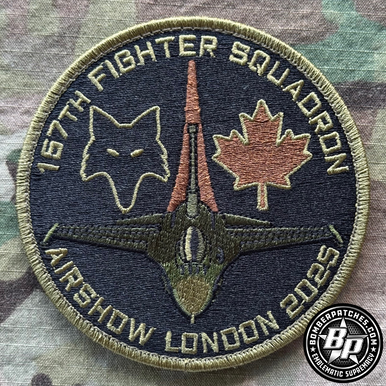 Designed and produced for the 157th FS, South Carolina Air National Guard for their participation in the London England Airshow. 2025 4″ dia, 100% embroidered, merrowed border, hook back.