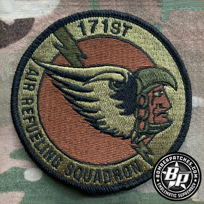 Designed and produce for the 171st ARS, Selfridge Air National Guard Base, Michigan. 3.5″ dia, 100% embroidered, merrowed border, hook back.