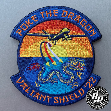 Designed and produced for the 174th Operations Group, Syracuse NY, for their participation in Valiant Shield 2022. 4″ tall x 3.6″ wide, 100% embroidered, heat cut border, hook back.