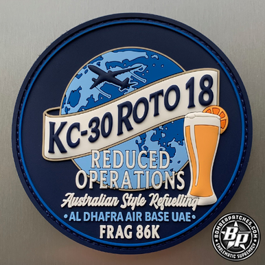 Designed and produced for 2 Squadron RAAF for their joint deployment operating with the 727th EACS, 2019. PVC, 4″ dia, 3D detail, hook back.