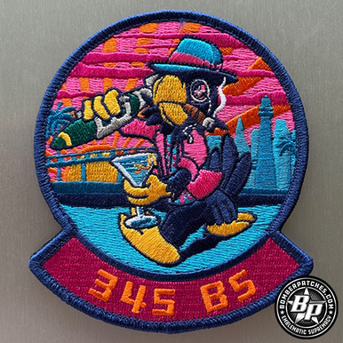 Designed and produced for the 345th BS, Dyess AFB, for their participation in the Hyundai Air and Sea show, Miami Florida. 2025 4″ x 3.5″, 100% embroidered, merrowed border, hook back.