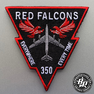 Designed and produced for the 350 ARS KC-135, McConnell AFB. 4″ tall x 3.6″ wide, 100% embroidered, merrowed border, hook back. A color version is available in a separate listing.