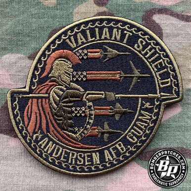 Designed and produced for the 36th Wing for their participation in the USAF, USN, Army, USMC Joint Force Exercise, Valiant Shield 2022. Flying the B-1, K-46, F-35, F-18E. 3.6″ tall x 4″ wide, 100% embroidered, heat cut border, hook back. The Full Color embroidered and the Full Color PVC versions are available separate listings.