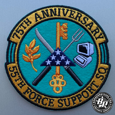 Designed and produced for the 55th Support Squadron, Offutt AFB, Nebraska The 55th Force Support Squadron consists of ten flights. Each flight is dedicated to supporting ACC’s largest Wing and a 57,000 person military/retiree community with quality service. 4″ dia, embroidered with felt background, heat cut border, hook back.