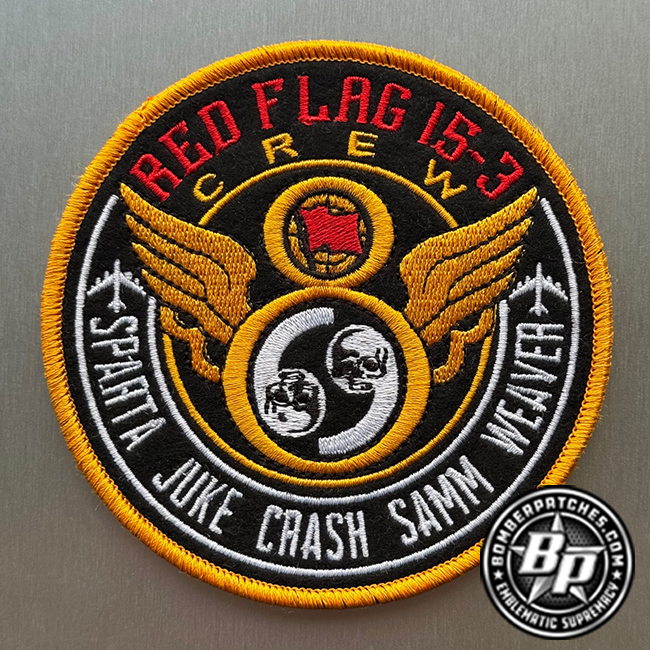 Designed for Aircraft Commander of Crew 8 (hardcrew) of the 69th Bomb Squadron, reigning from Minot AFB, ND, for Red Flag, 15-3, July 2015. A very limited number was retained for sale to collectors. This patch features the Eighth Air Force emblem with the Red Flag and 69th Skulls morale patch design incorporated, along with the callsigns of the five crewmembers, embroidered on a black felt background. 4.0″ dia, merrowed border, hook back.