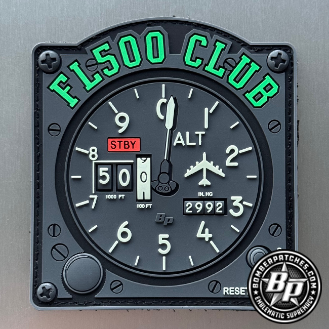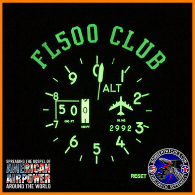 The detail replicates the altimeter in the B-52 in PVC Rubber, and different from the previous version, all detail glows, including the green “FL500 CLUB”. The original notion behind this patch was for crew members who have actually made it to that altitude to have access to it. 4.0″ wide, 3.75″ tall, PVC, 3D and glow detail, hook back.