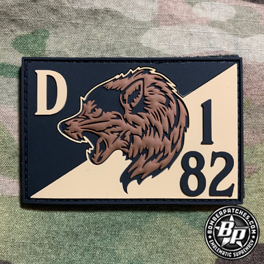 Designed and produced for D Co 1-82 AB Timberwolves, Ft. Bragg, NC 2021 3″ wide x 2″ tall, PVC, 3D detail, hook back.