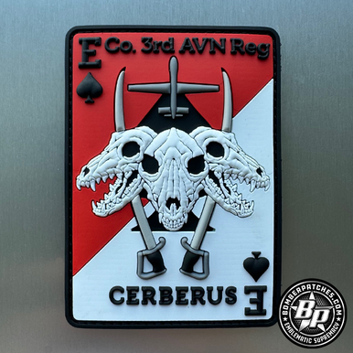 Designed and produced for the E Co 3rd AVN Regiment, Hunter Army Field, Georgia. E Co operates the Boeing AH-64 Apache attack helicopter, Sikorsky UH-60 Black Hawk helicopter, and Boeing CH-47 Chinook helicopter. 2024 Cerberus refers to Hounds of Hades. 4″ x 2.8″, 3D detail, hook back.
