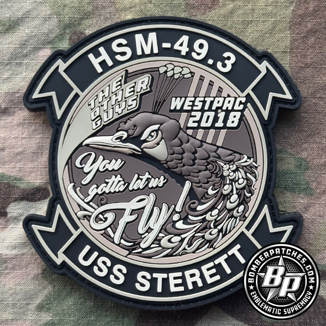 Designed and produced for the HSM 49 Det 3, flying the MH-60R Seahawk, for their 2018 Pacific deployment. PVC, 4″, 3D detail, hook back.
