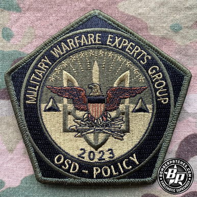 Designed and produced for the Military Warfare Experts Group OSD-Policy Office. Fort Belvoir, VA. 2023 4″ x 3.8″, 100% embroidered, merrowed border, hook back.