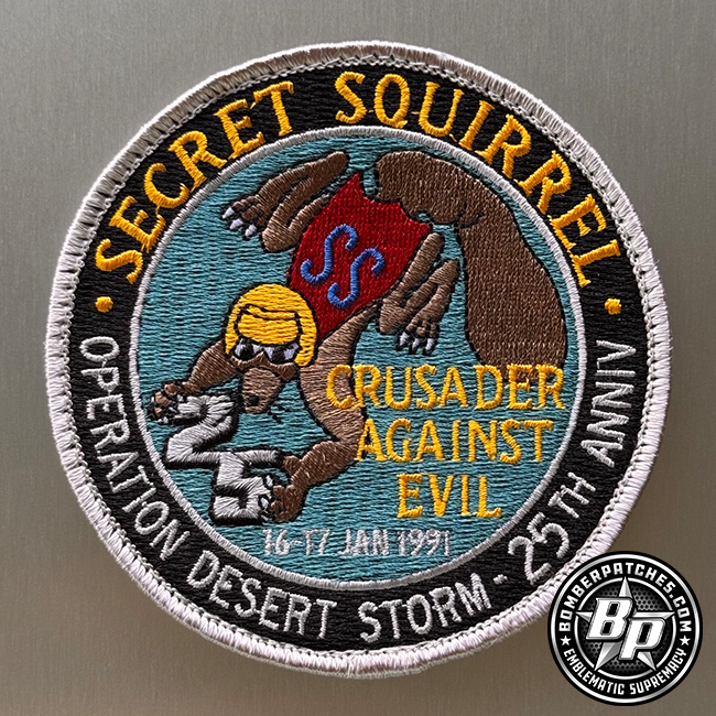 Operation Secret Surprise, flown by the 596th Bomb Squadron, Barksdale AFB, also known as Secret Squirrel, was a long-range B-52G Stratofortress cruise missile strike against Iraqi targets that initiated the bombing campaign during Desert Storm (It was given the unofficial nickname ‘Operation Secret Squirrel’ by the B-52 crews.) The mission took place January 16, 1991, and ended January 17, 1991. Each version of this patch was commissioned as part of the reunion of crewmembers to recognize the 25th anniversary of the operation. 4″ dia, 100% embroidered, merrowed border, hook back.